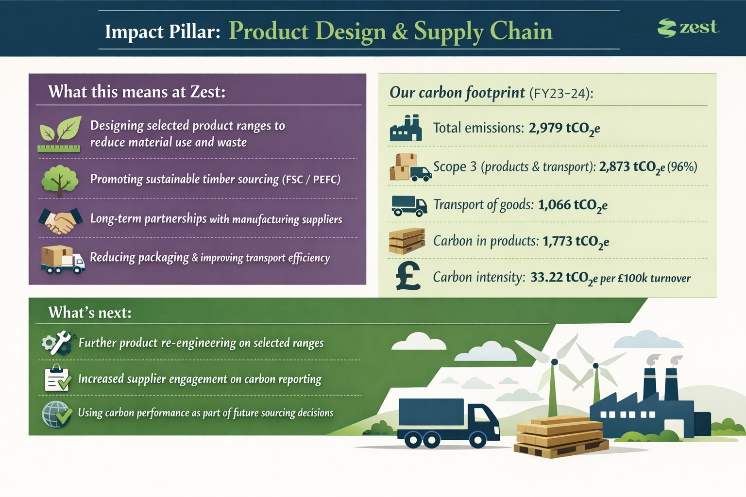 Our greatest impacts relate to product materials and transport, so our focus is on responsible design, ethical sourcing and reducing supply-chain emissions.