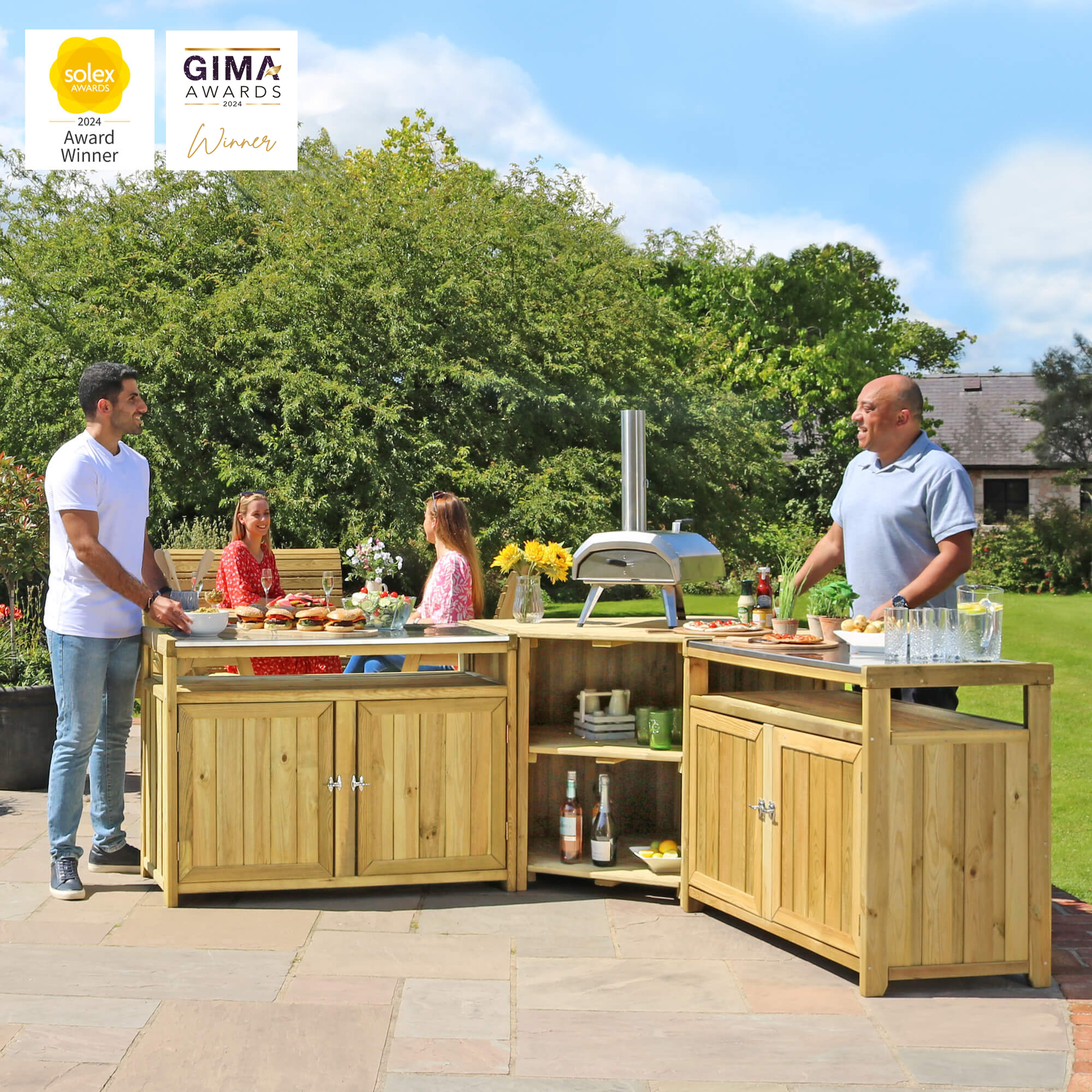 A stylish, modular solution for outdoor entertaining. A re-design of the original kitchen incorporating a sturdier frame, pre-hung doors easier to build, adjustable shelving and a new brushed stainless steel top. Includes adjustable shelving and an open fronted storage for easy access.